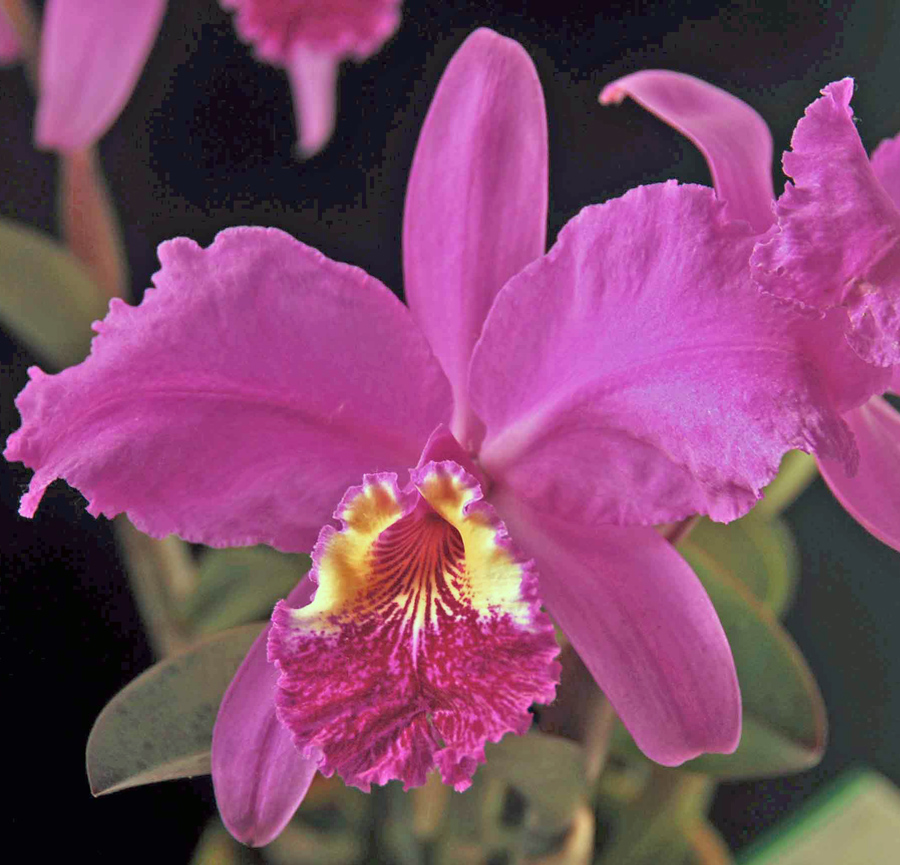 (C. violacea v. flammea x C. lueddemanniana ‘Odom’s Dark’). We remade this cross using very dark parents. Hope to get some well shaped flat magenta 4″-5″ flowers with good substance and presentation. Pictured is parent C. lueddemanniana ‘Odom’s Dark’.