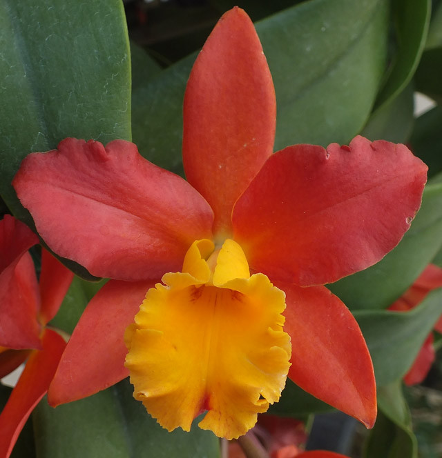 (Blc. Orange Nuggett x Lc. Jalapa). Clusters of deep reddish-orange 3″ flowers with a bright gold daffodil-like lip. Very striking!