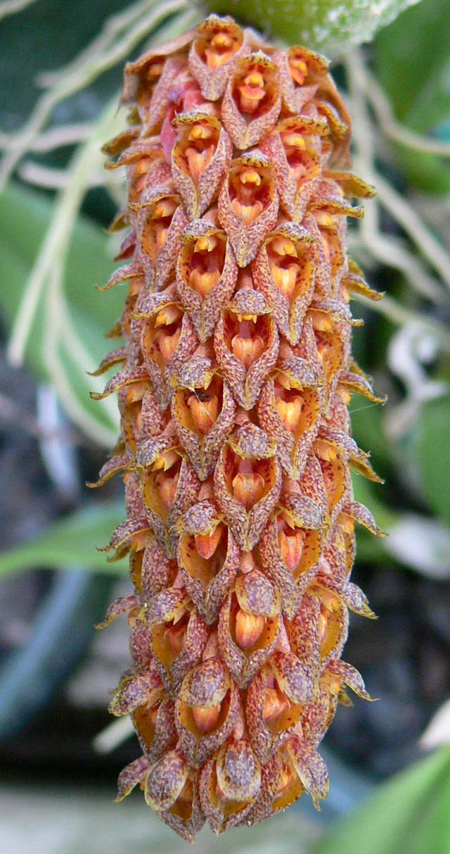 Enlongated pine cone-shaped inflorescence of 100 or so tiny golden brown flowers that turn red before expiring. Very unique orchid!
