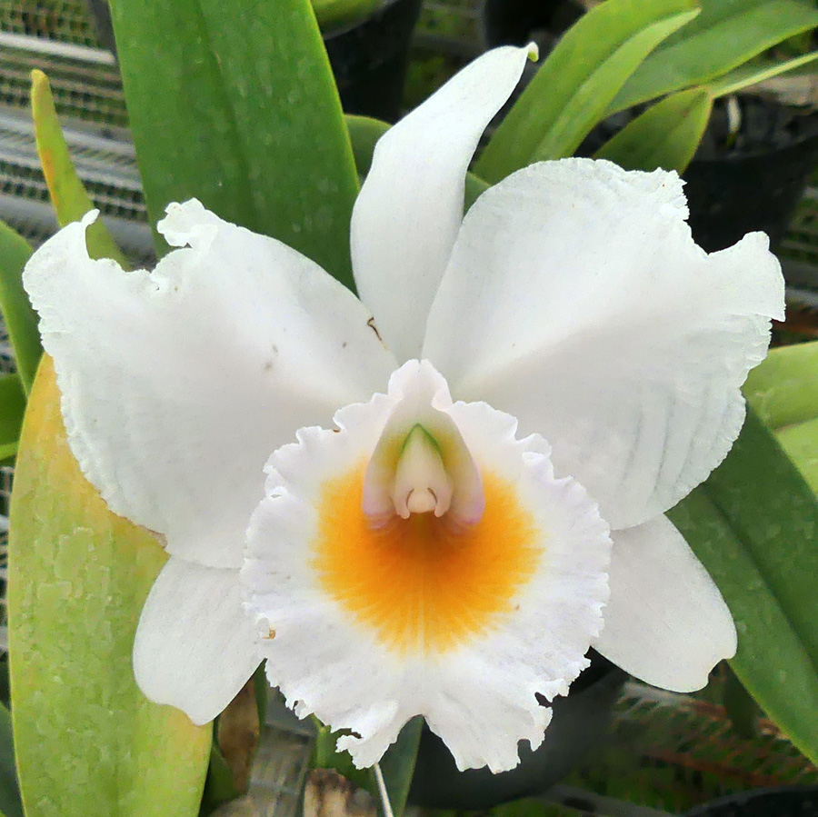 These seedlings of this delighful Columbian cattleya species should bloom out very light lavender to near white with a deep gold throat. The first 2 photos show the parent plants. The third photo is the first seedling to bloom.