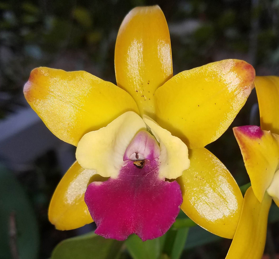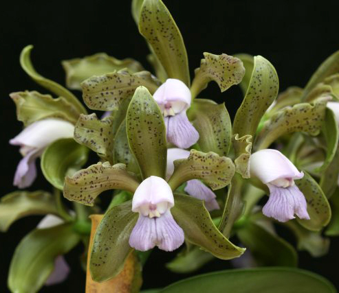 Not exactly sure what to expect from this cross. Waxy clusters of 3″ fragrant flowers. Probably will get pale yellow, cream, or tan flowers with a purple spade lip. Some may have spots. Pictured are the parent plants.